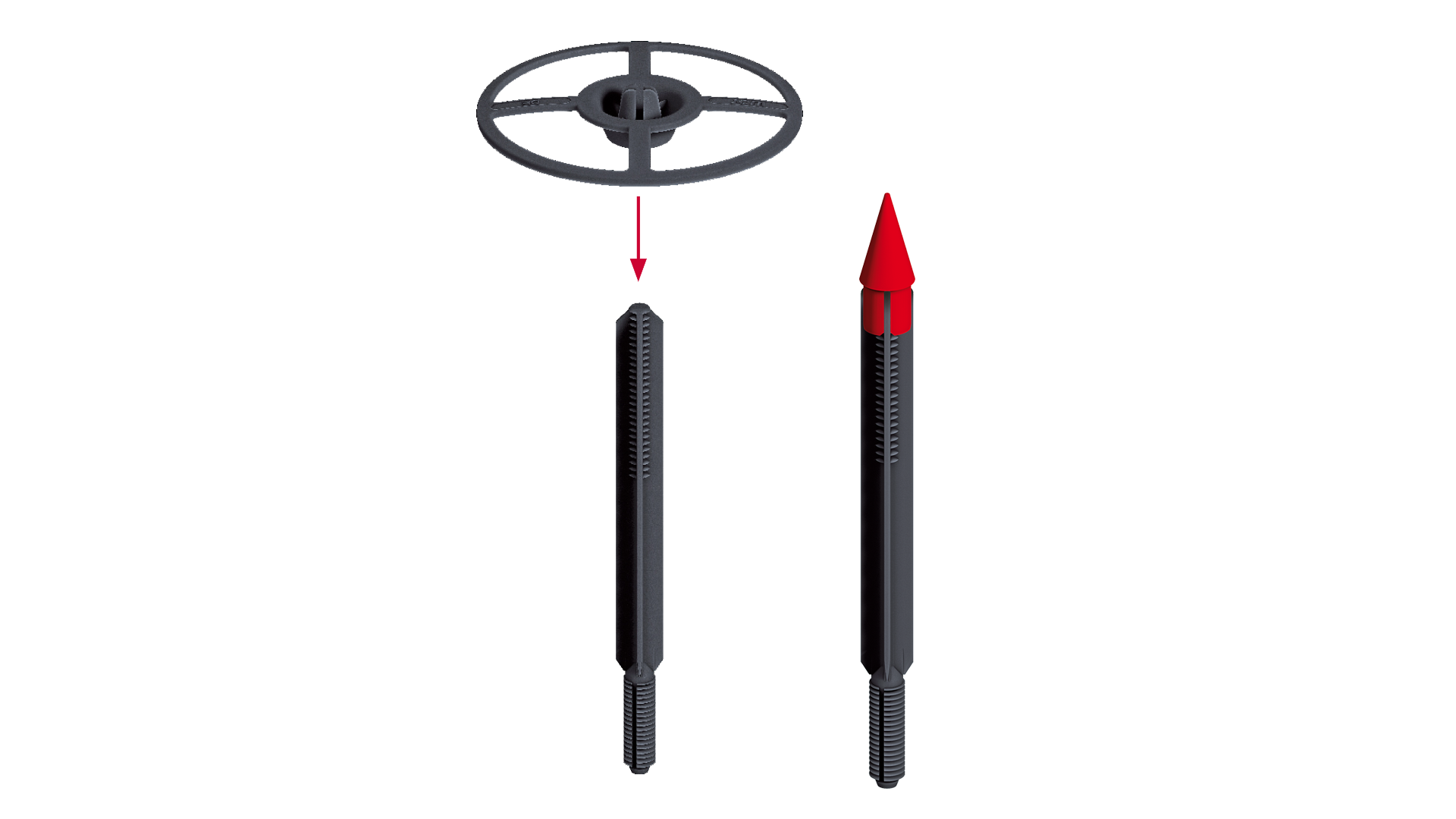 Fijación mecánica para Ventirock Duo compuesta por dos elementos: un vástago, adaptable a distintos espesores de aislamiento, y una arandela común para todos los vástagos.