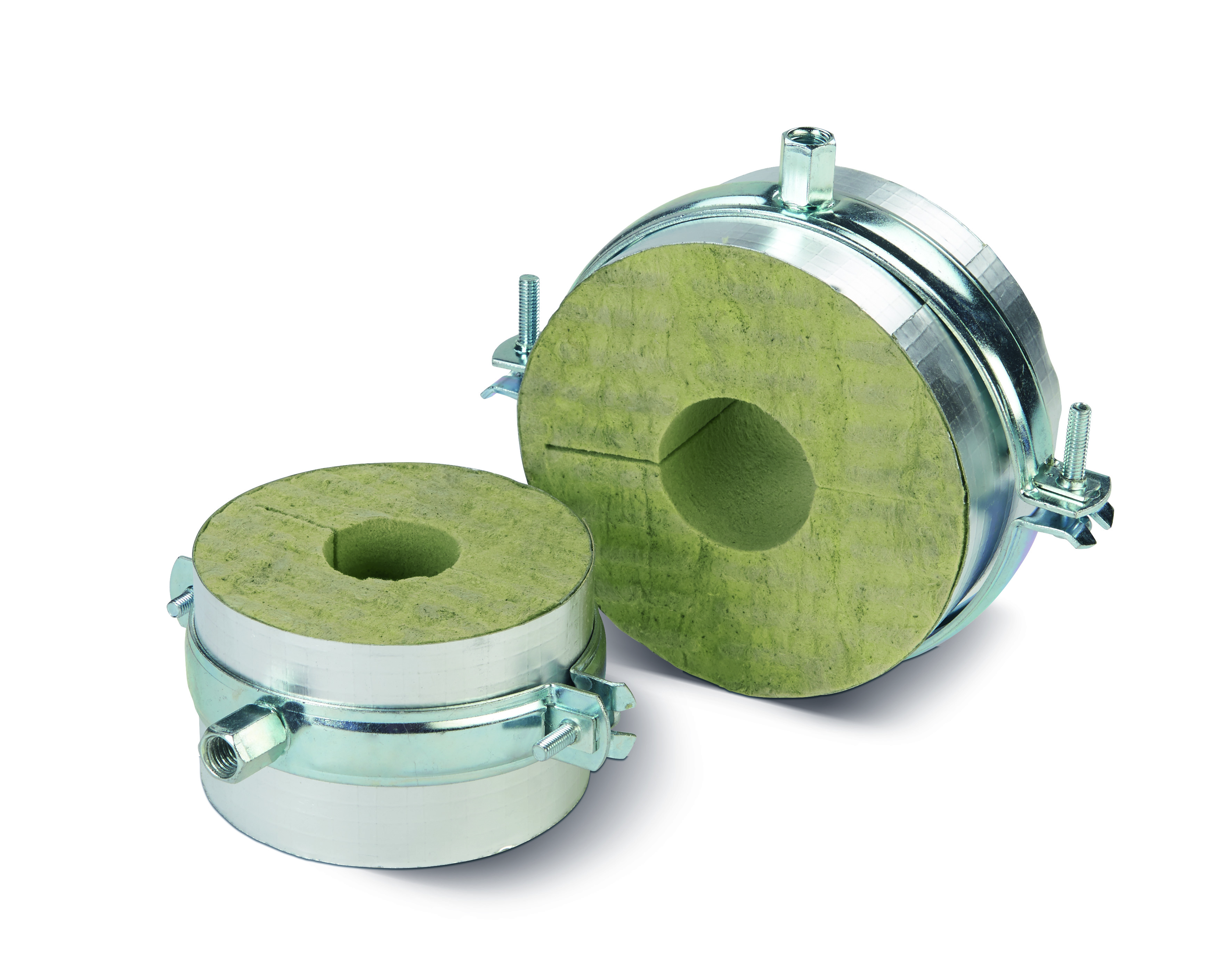 Coquilla concéntrica de lana de roca revestida con una lámina de aluminio reforzada que actúa como barrera de vapor.
