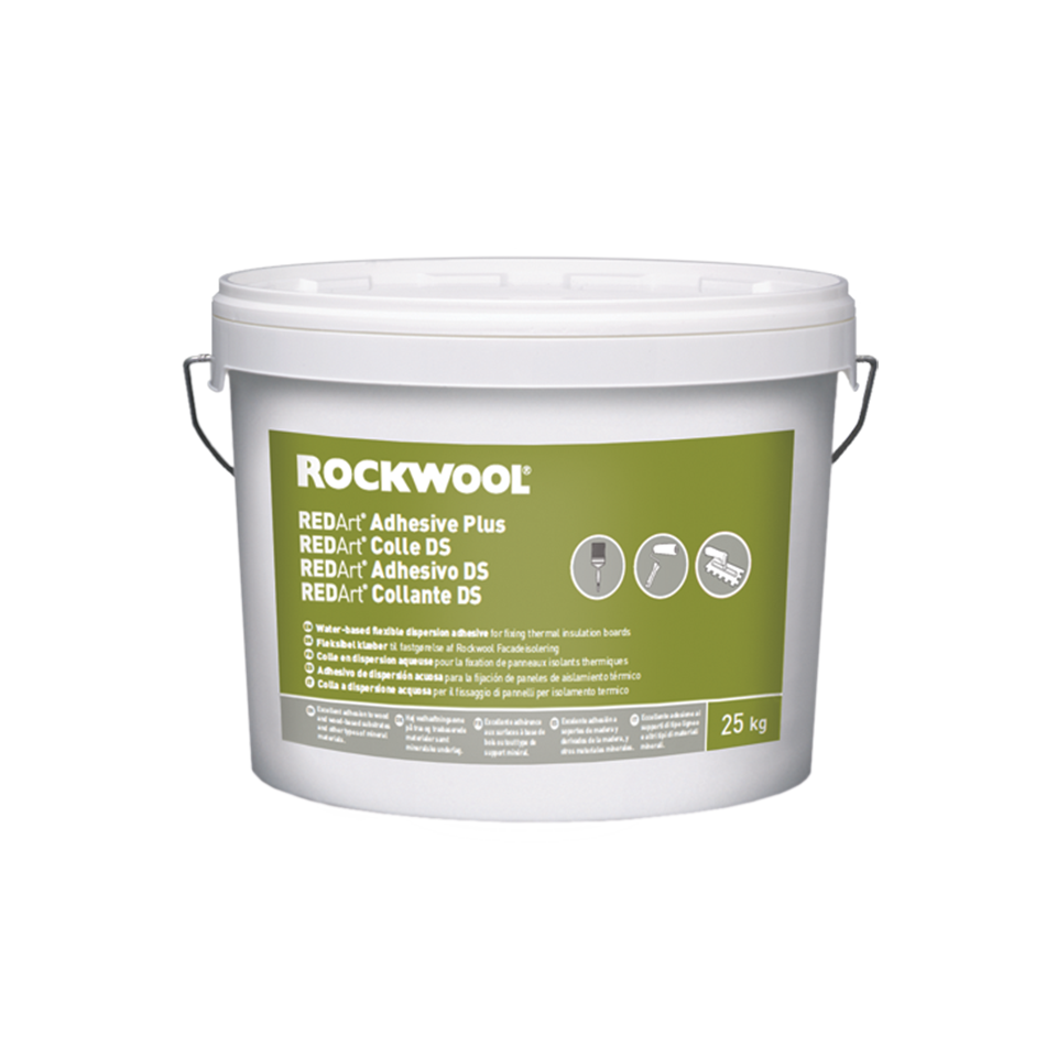Adhesivo de dispersión acuosa de color blanco, listo al uso, especialmente formulado para la fijación de los paneles de lana de roca sobre soportes de madera.