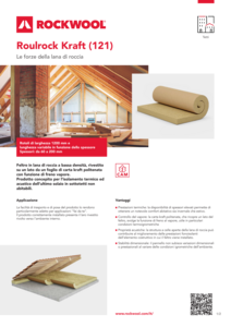 Feltro in lana di roccia a bassa densità, rivestito su un lato da un foglio di carta kraft politenata con funzione di freno vapore. Prodotto concepito per l’isolamento termico ed acustico dell’ultimo solaio in sottotetti non abitabili.